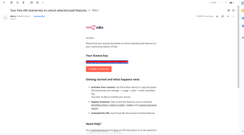 Check your email for the admin account setup. N8N will send an email with a license key to activate your N8N application.