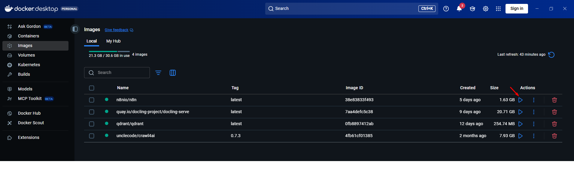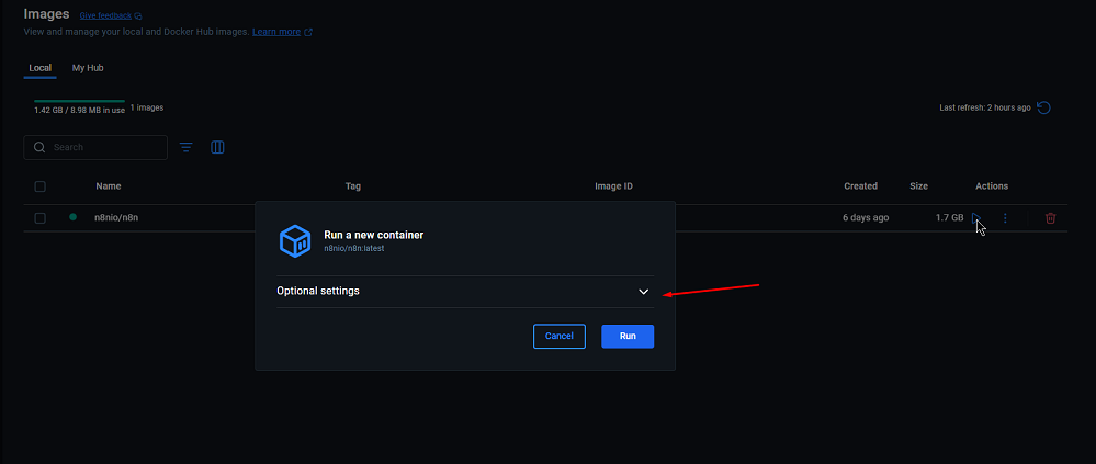 In the Images menu, after the download is complete, you will see an N8N image. Click on run button to start a container for n8n application
