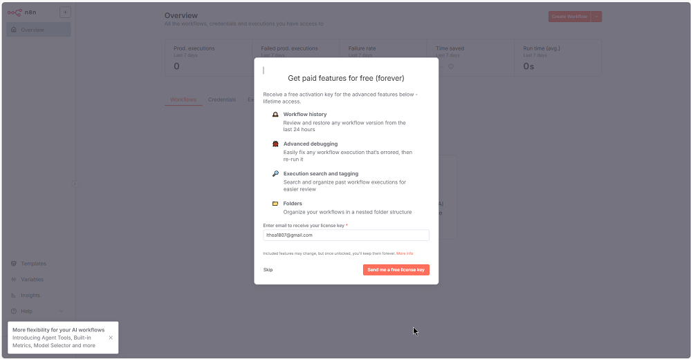 A popup titled “Get paid features for free (forever)” appears. Click “Send me a free license key.” n8n will email you a license key that unlocks advanced features such as workflow history, debugging tools, and execution search.