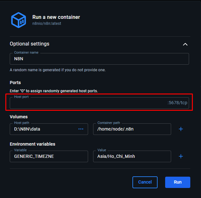 Downloading the N8N image may take some time. After it's finished, click the Run button to create an N8N container.