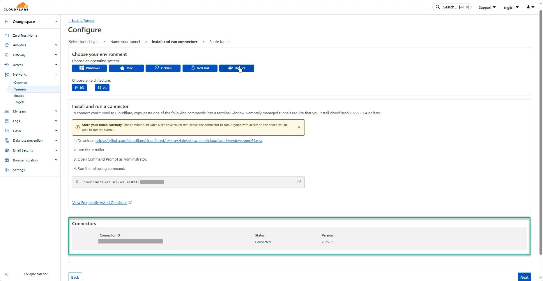 4. Configure the tunnel. Select the operating system of the device where your n8n instance is running, then follow the on-screen instructions to install the Cloudflare connector (Cloudflared). This connector will securely link your local n8n service to Cloudflare’s network.