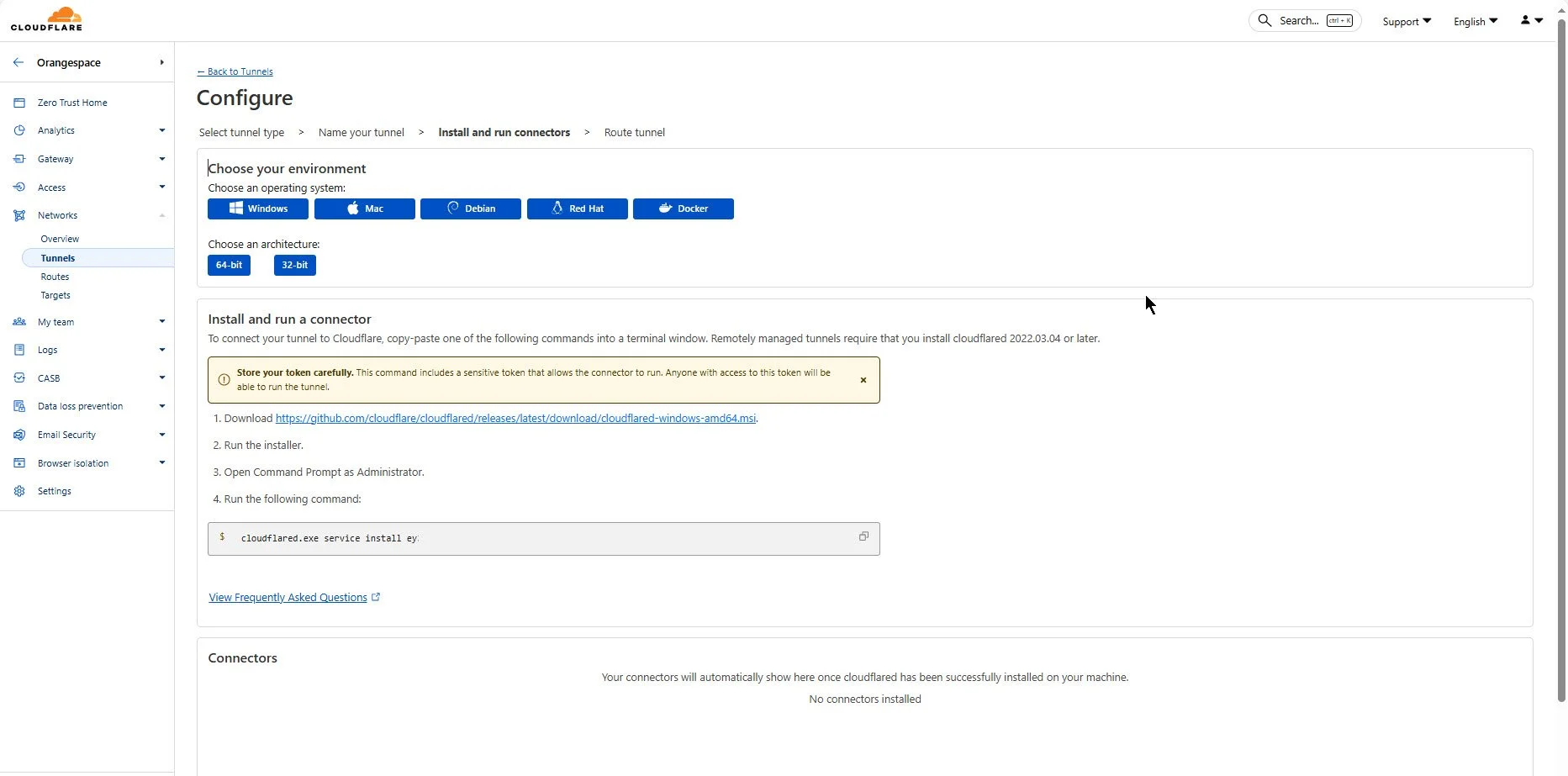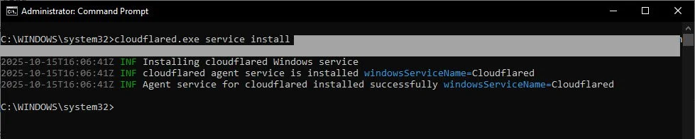 5. After installing the connector, open Command Prompt (or Terminal on macOS/Linux) with administrator privileges, and run the command provided by Cloudflare. This command automatically registers your device and establishes a secure connection between your local environment and the Cloudflare network, preparing your tunnel for configuration and use.