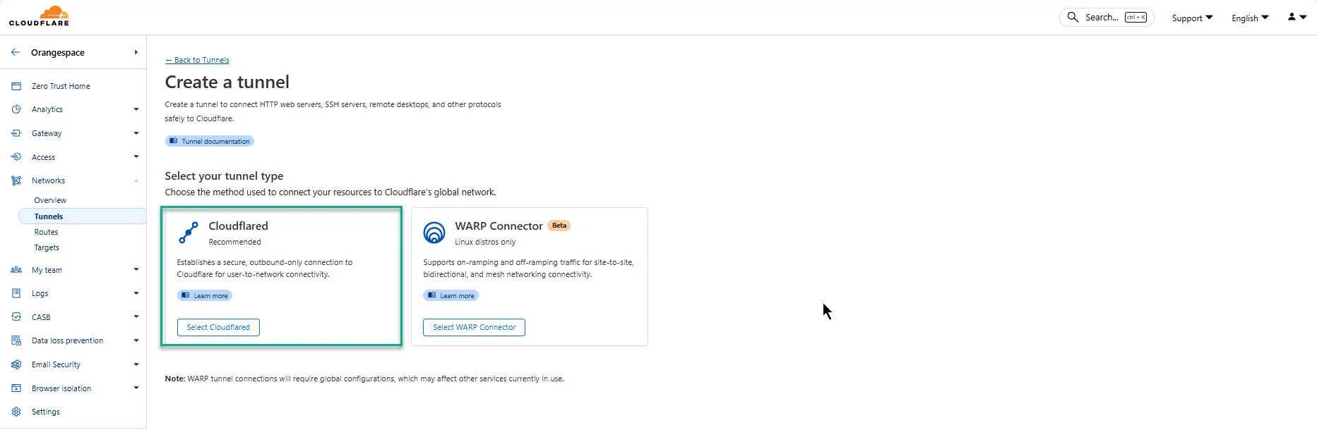 1. On Zero Trust Dashboard, access Networks —> Tunnels —> Create a tunnel