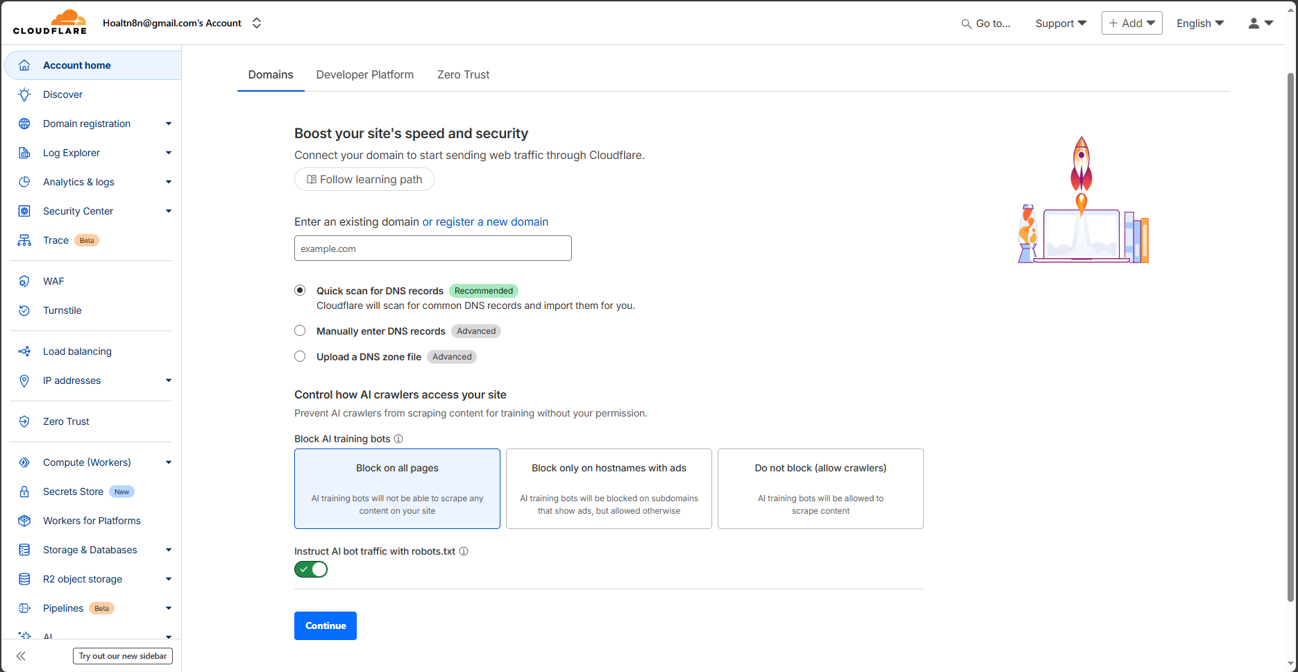 3. Enter your existing domain (If you haven’t added any domains to Cloudflare yet, this interface will appear automatically). Click Continue to run next step