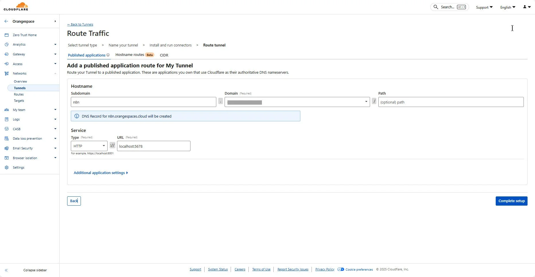 3. Click on Complete setup to save your configuration. After this step, Cloudflare will automatically create a DNS record for your subdomain and route all traffic through your secure tunnel, ensuring that users can only access your n8n instance via Cloudflare’s encrypted and protected network.